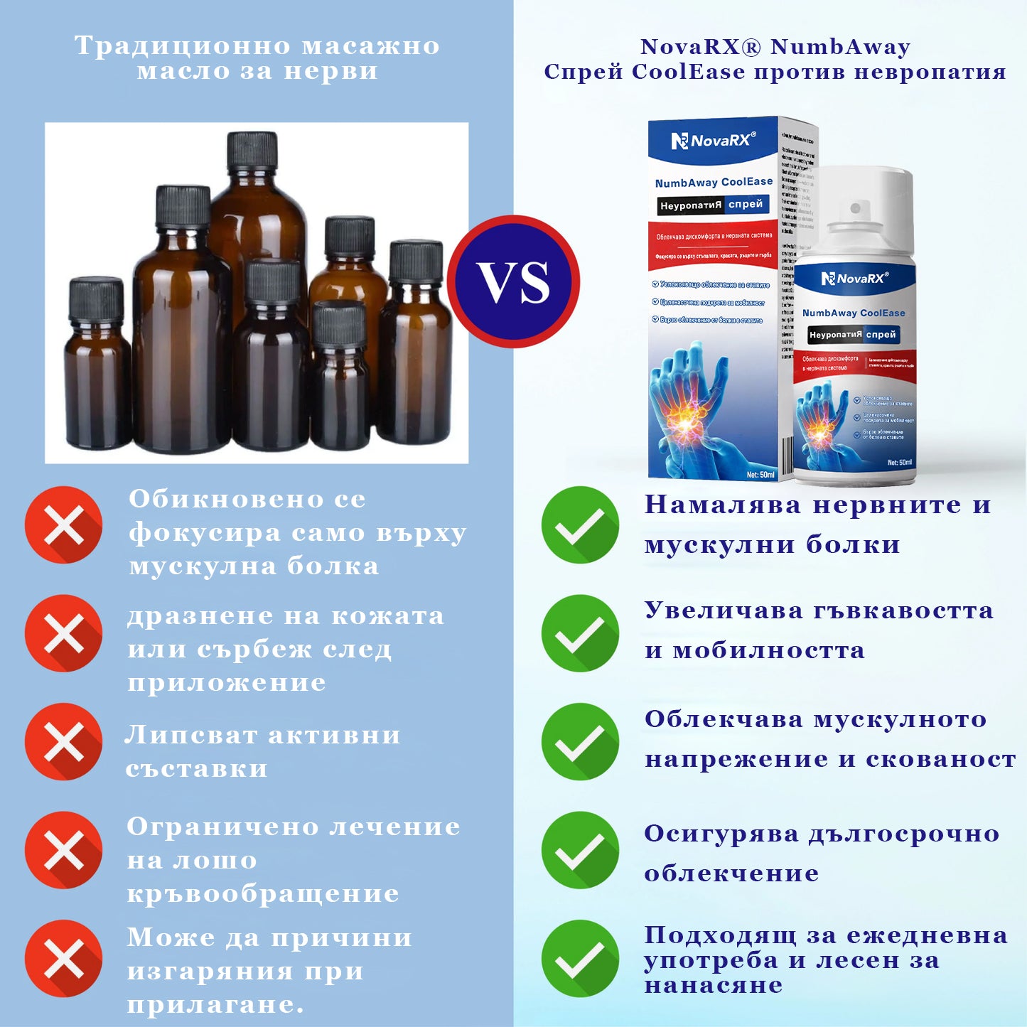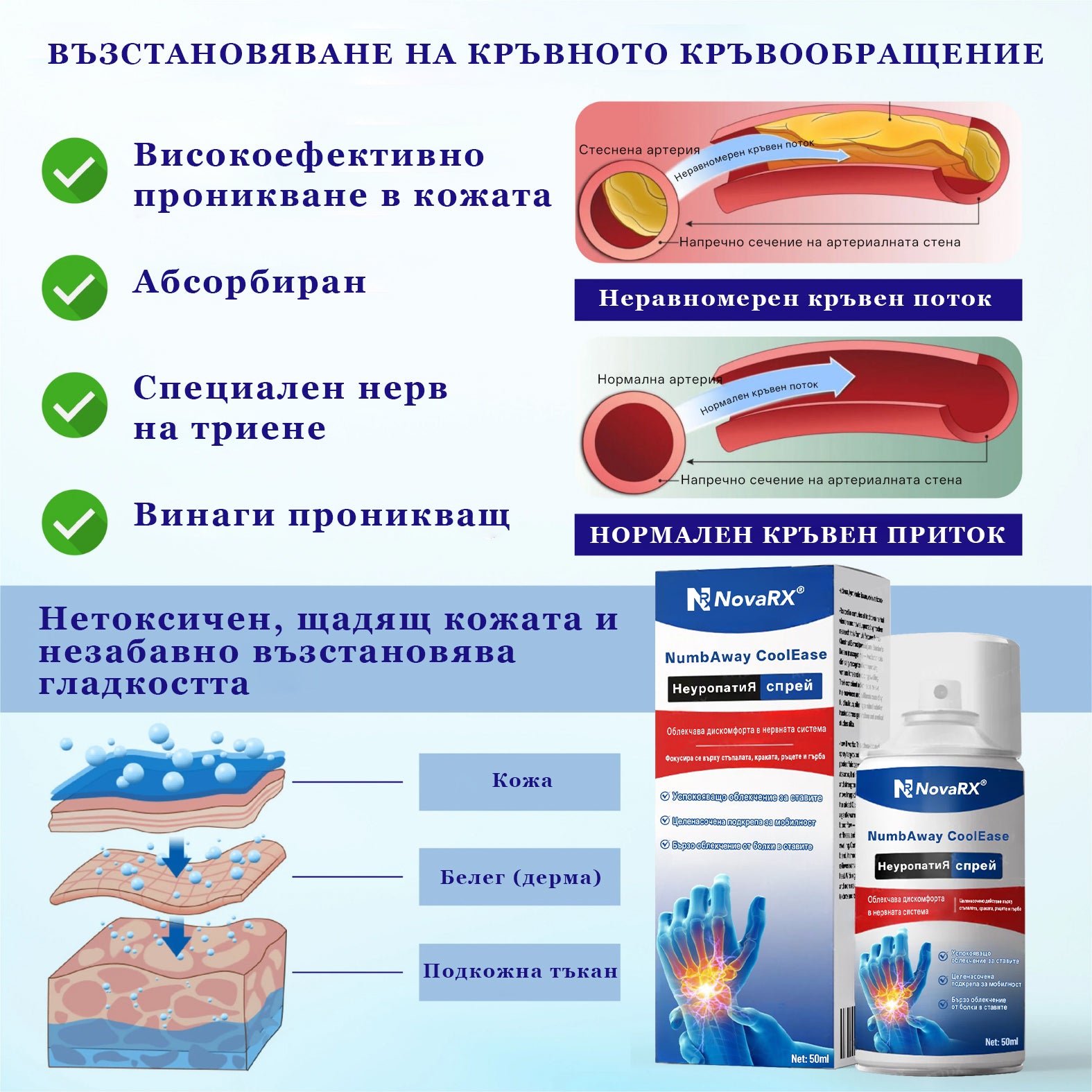 NovaRX® NumbAway CoolEase Неуропатия спрей е обогатен с мощна комбинация от клинично доказани съставки, които работят заедно, за да успокоят раздразнените нерви, блокират болковите сигнали и подкрепят дългосрочното здраве на нервите.